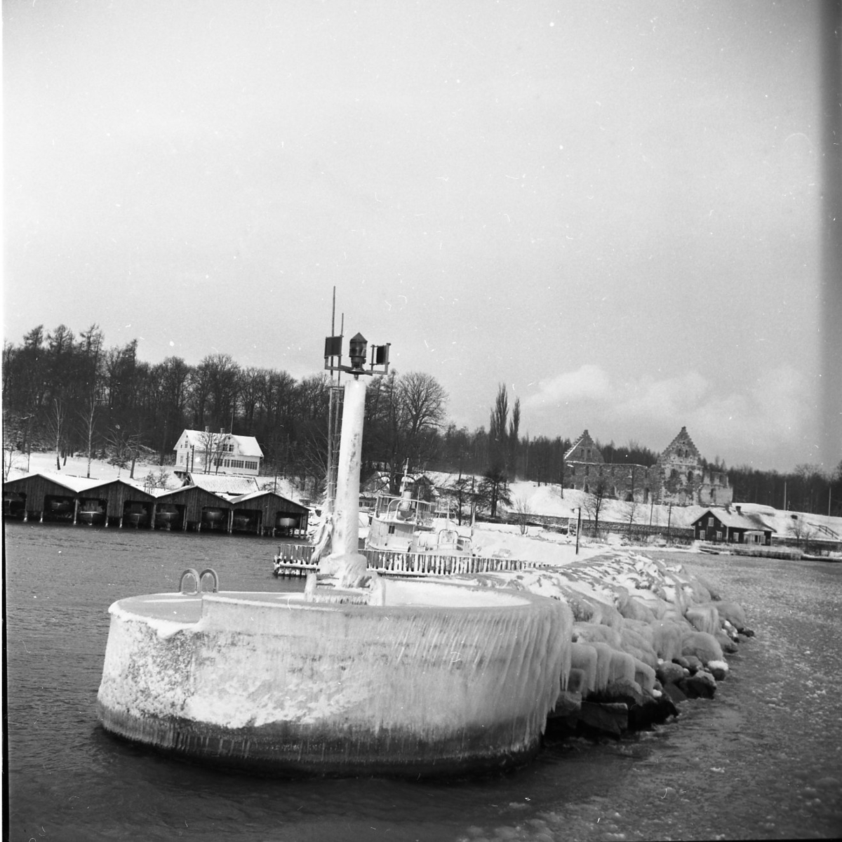 Vinterlandskap. Visingsborg syns i bakgrunden.