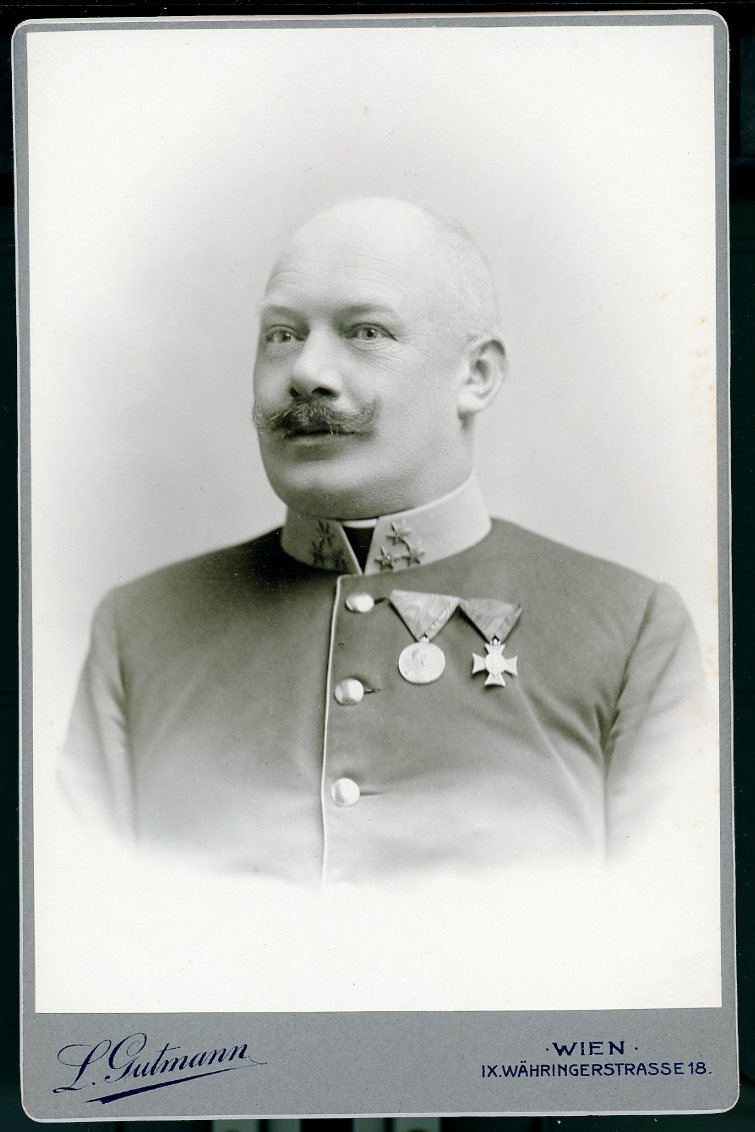 Kabinettsfotografi: Österrikisk-ungersk överste med medaljer på bröstet, och vars namn inte kan tolkas.