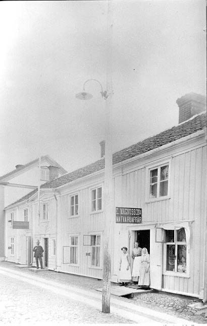 En tvåvåningsbyggnad med locklistpanel. Tre kvinnor i förkläde står i närmaste entré under skylt: "E. Magnussons Matvaruaffär" Flera fönster, vädringsfönster, står öppna. I borte entrén står en man under skylt: "H. Rosenborg & Co. Sybehörshandel".