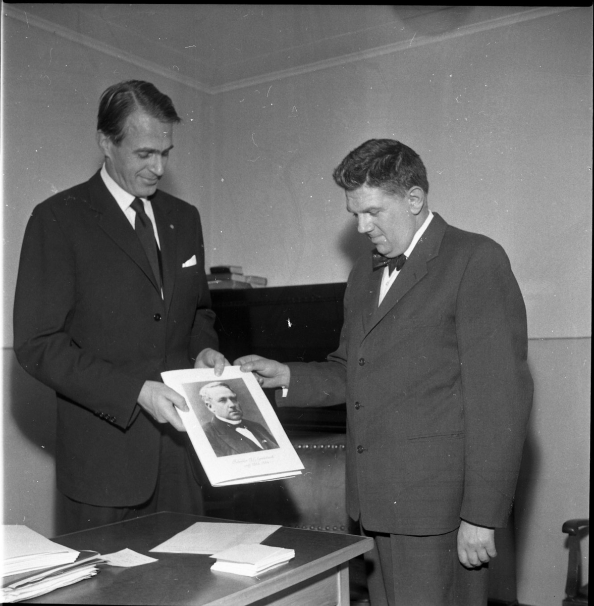 Medaljutdelning på 310-årsjubileet av stadsfullmäktige. Två män står och håller i ett porträtt av en tidigare ordförande i stadsfullmäktige.