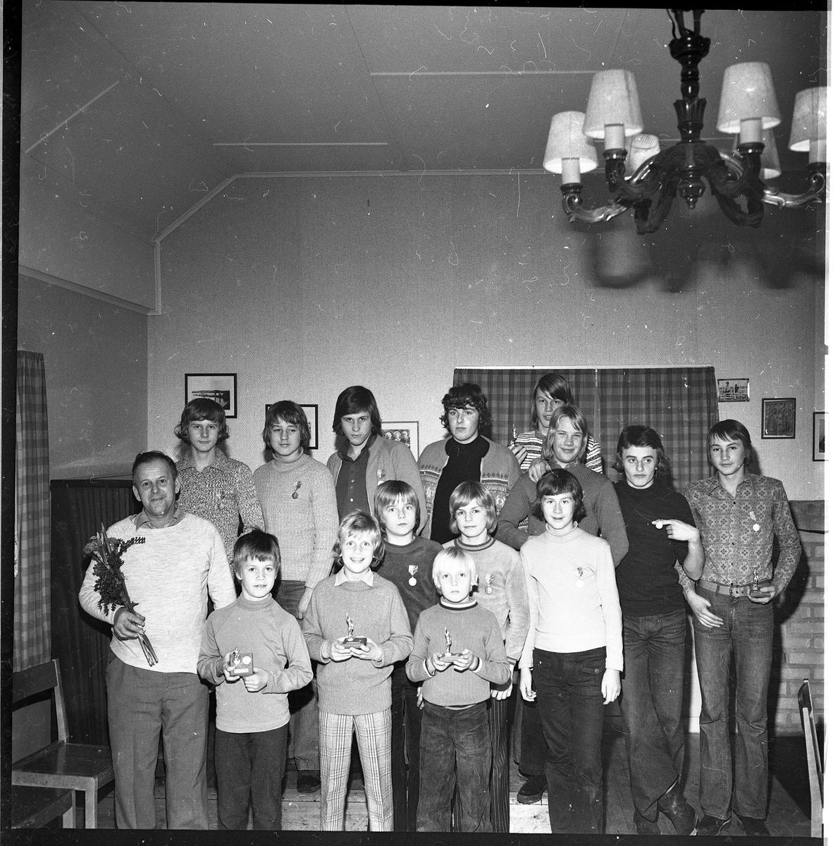 Ungdomar och en man, med blommor och utmärkelser, uppställda för fotografen.