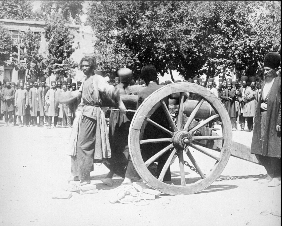 "Avrättningssätt i Chiraz för blott 3 år sedan (1911)." En man fastbunden med ryggen mot en kanons mynning.