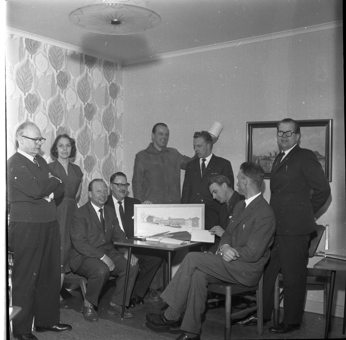 Nio personer står samlade runt ett bord. Några står och några sitter, vissa utav dem bär slips och kavaj. På bordet står en tavla med några hus på, möjligen södra delen av Gränna torg med ombyggnadsförslag av kvarteret Hjorten. Från vänster står: Holger Andersson, Dagmar Petri, Nils Lindekrantz, Sven-A Sjöstrand, Björn Aring, Roland Fredriksson, C.W Lothigius, Stig Andersson och Karl Erik Johansson.