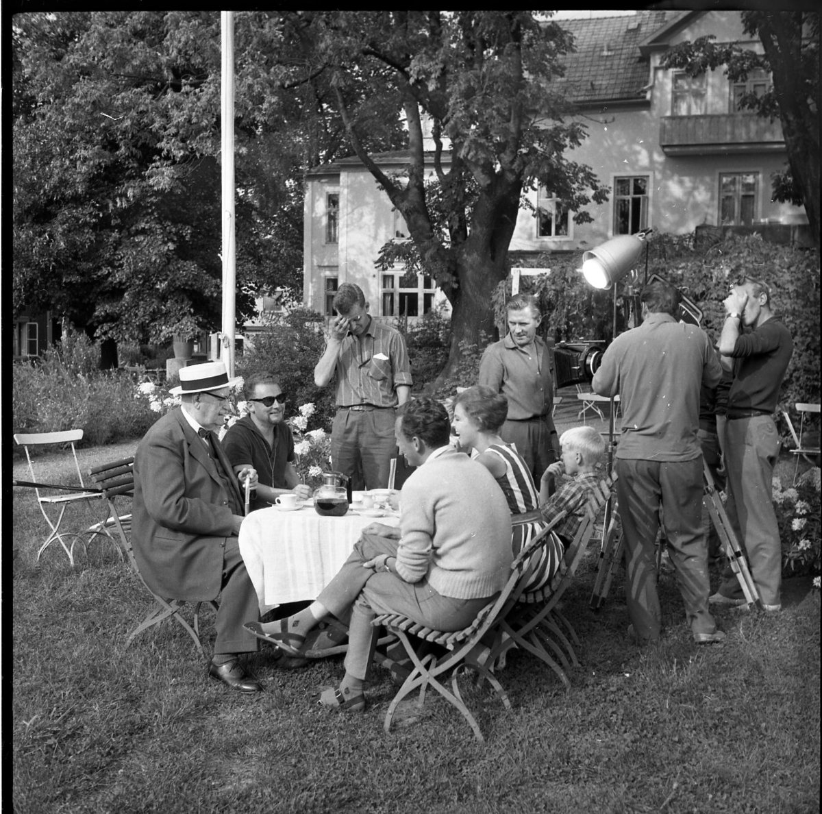 En man, en kvinna och två pojkar sitter vid ett trädgårdsbord i en trädgård. Framför dem sitter två herrar. Ståendes runt bordet befinner sig fyra personer. En filmar de sittandes.
