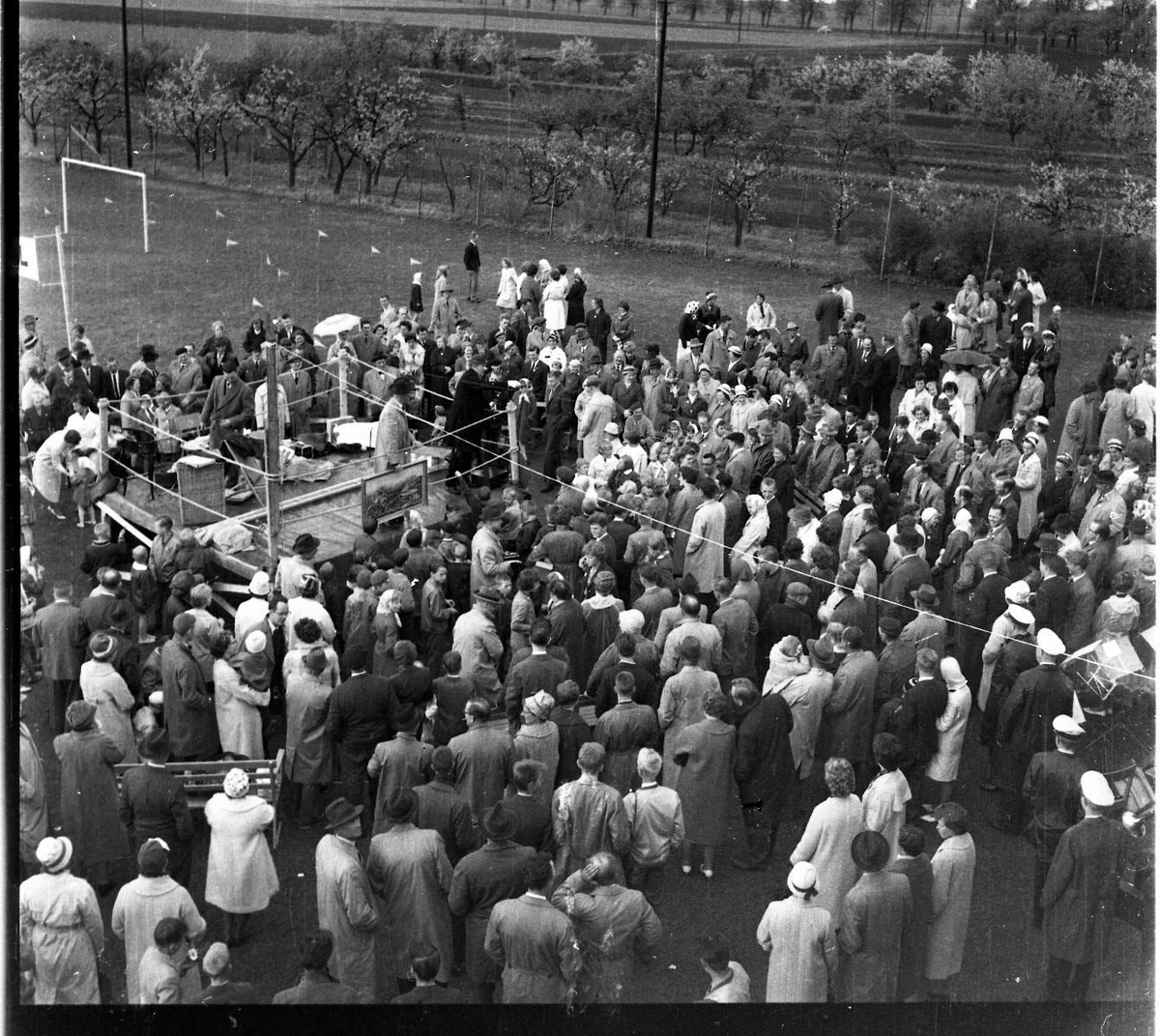 Fotografi från Realskolan i Gränna ned mot dess gård med en stor folksamling runt en boxningsring. I bakgrunden syns fruktträd och allén ned mot hamnen.