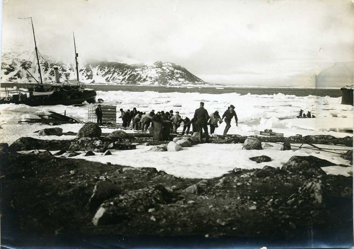 Ballongen Örnen i sitt kolli förs i land på Danskön från kanonbåten Svensksund till vänster. Ångaren Virgo skymtar till höger. Mycket drivis mot stranden.