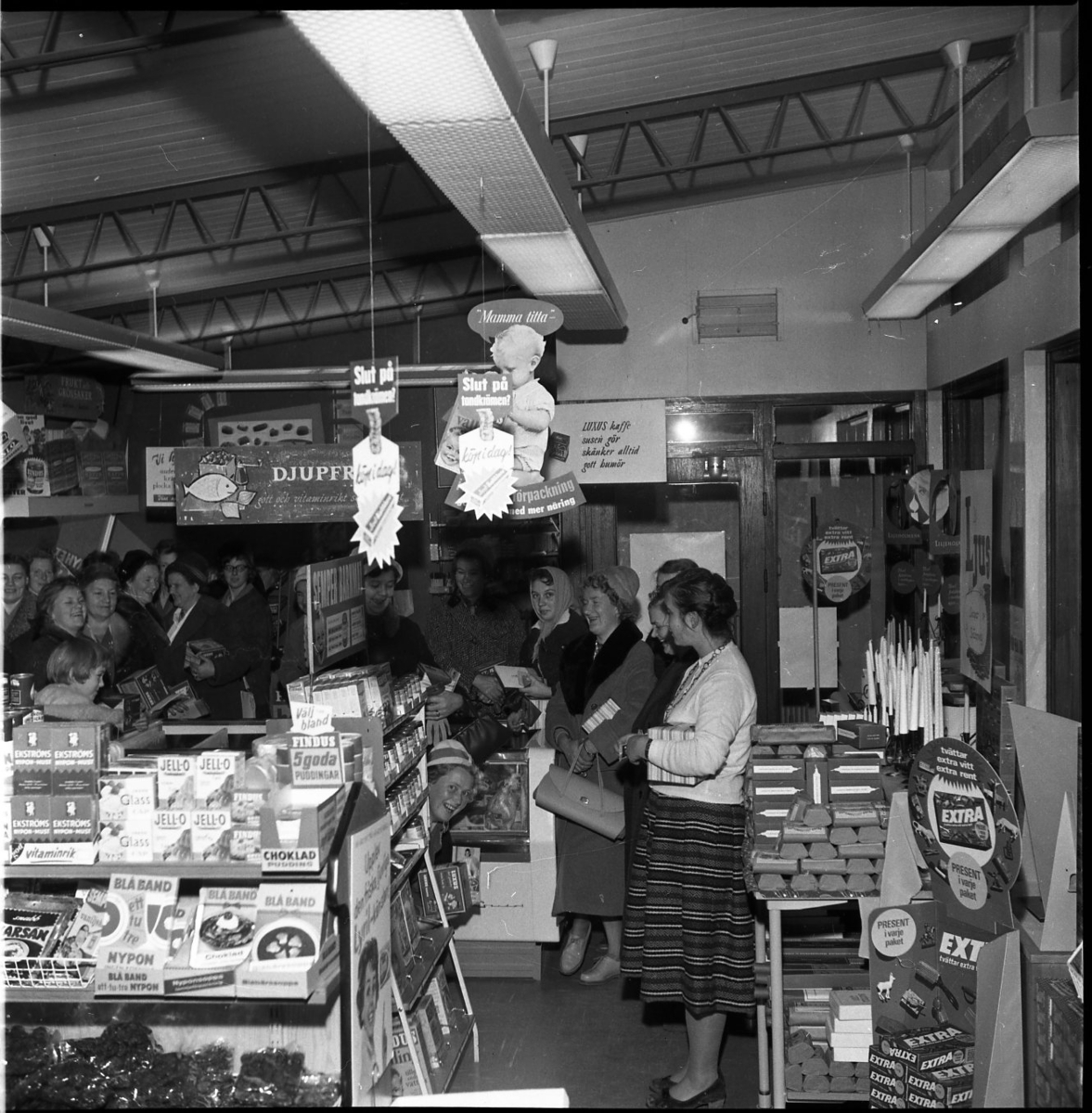 Kvinnor står i en vid båge i en mataffär. En kvinna tittar fram bakom en hylla och ler mot kameran. På hyllorna står matvaror med varumärken som Ekströms, Blå band och Jell-o.