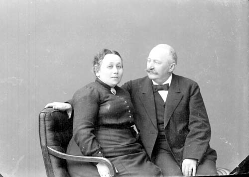 Grupporträtt med sittande äldre man och kvinna. Mannen tittar mot kvinnan, hustrun.