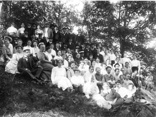Ett stor grupp av män, kvinnor och barn sitter och står på en grässlänt. Det är Olga och Gustaf Weman på Aranäs gård med personal och deras familjer.