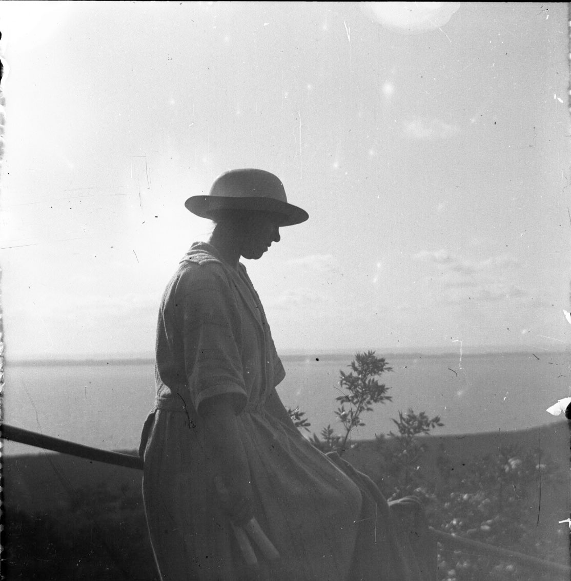 En okänd kvinna sitter på en ledstång, troligen i trappan till Grännaberget, i kvällsljus över Vättern. Hon bär hatt och ljus klänning. I höger hand håller hon möjligen två polkagrisar.