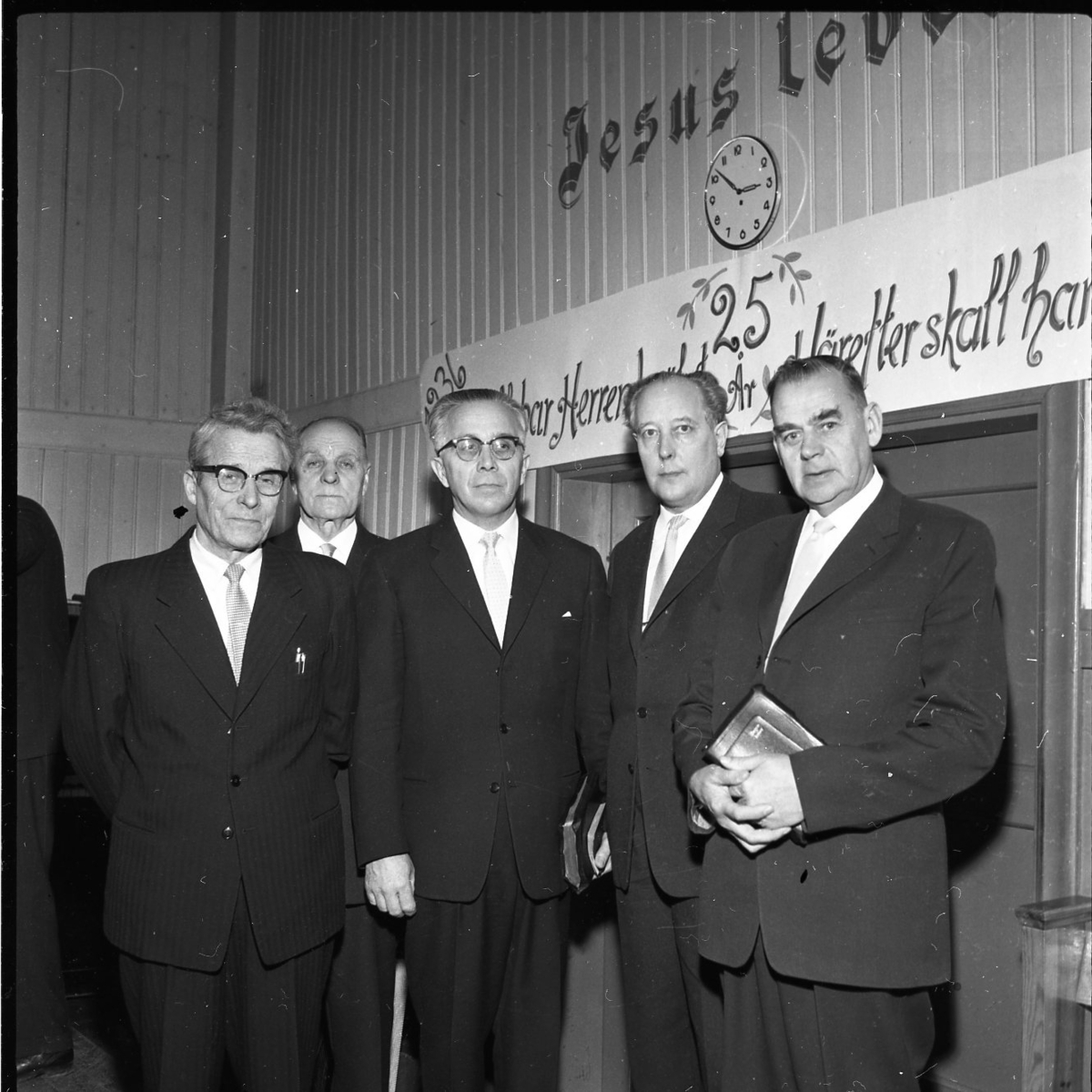 Fem kostymklädda män står i en foajé till Frälsningsarméns lokal. I mitten står pastor Robert Svensson. På väggen bakom dem texten "Jesus lever" samt en delvis dold text med budskap om 25-årsjubileum.