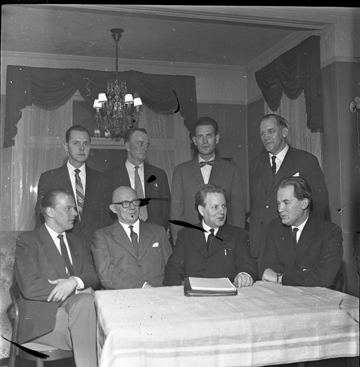 Åtta herrar i en salong, Fyra sitter vid ett bord, fyra står bakom. En mapp ligger på bordet.