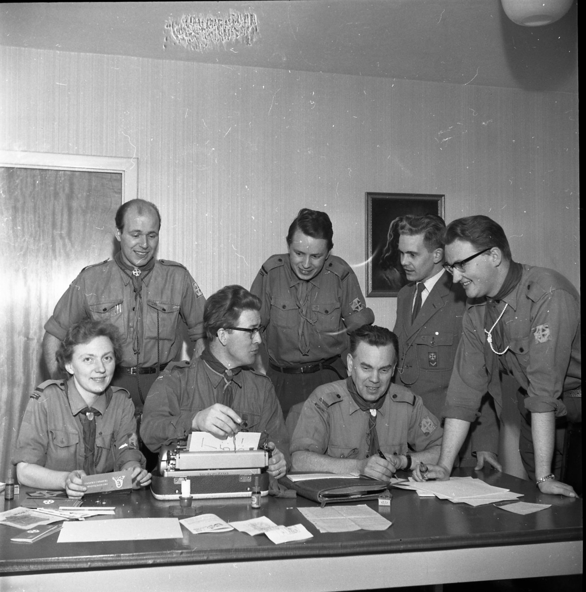 Sex män och en kvinna befinner sig vid ett skribord. Tre personer sitter, varav en sitter framför en skrivmaskin. Fyra personer står lutade över de sittades.