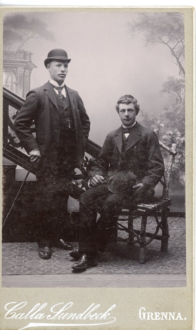 Kabinettsfotografi: två unga män med kubb och spatserkäpp, en av dem sitter.
