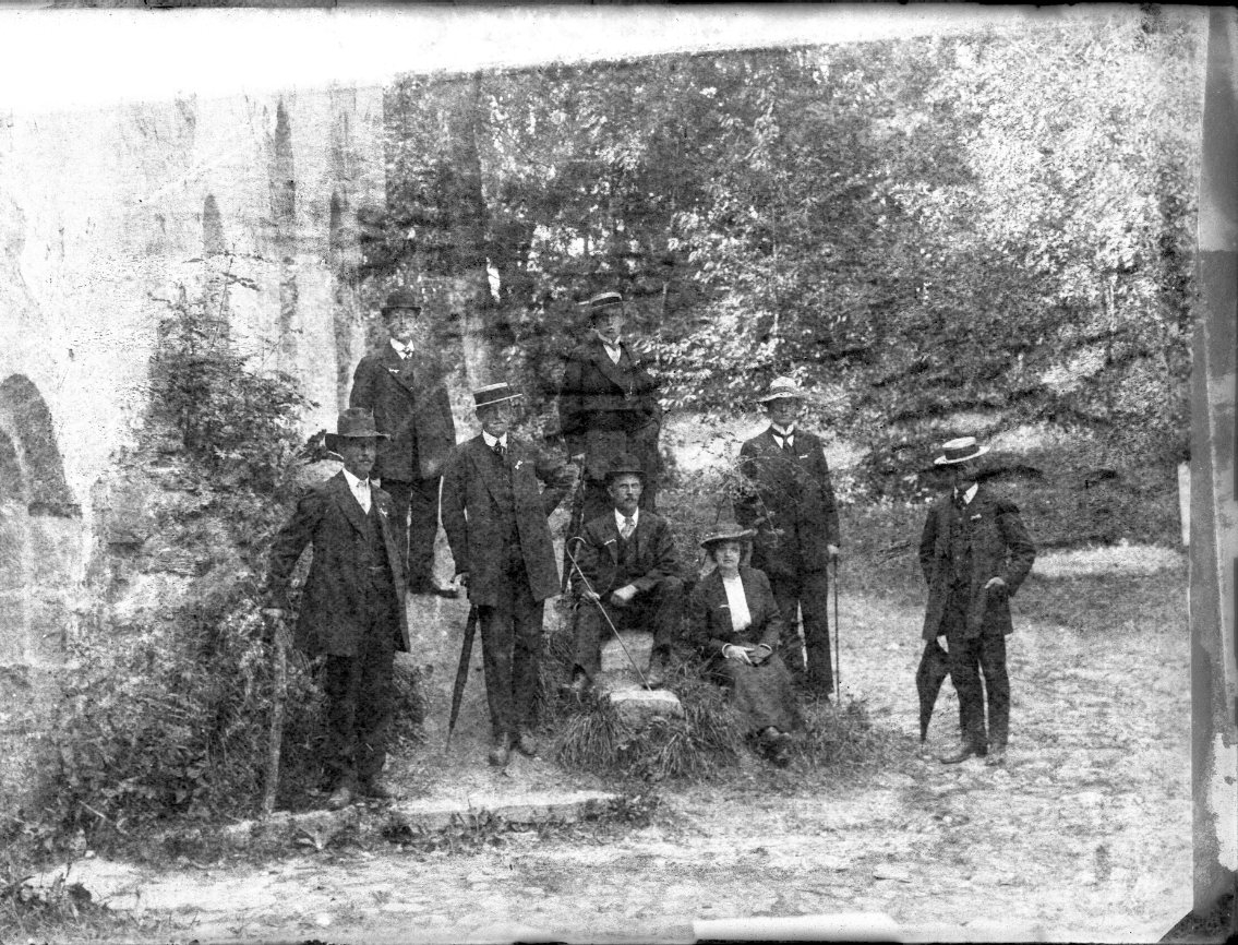 Sju män och en kvinna står och sitter vid vad som er ut att vara en ruin. Någon på bilden är J L Gustafsson från Lidköping.