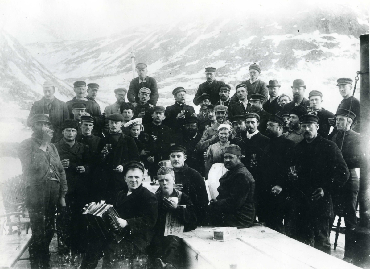 Besättning och expeditionsmedlemmar samlade på Virgos akterdäck utanför Danskön 1896, troligen midsommarafton 23 juni. Stewarden Charlotta Olsson till vänster och kocken Hanna Wessberg till höger; lotsen Stranne med dragharmonika och Strindberg med fiol. Andrée står till vänster om Strindberg, intill Charlotta. Bror Arbin och Hjalmar Brunnström står i bakre rad, 2:a respektive 5:a fr vänster, den senare med bakomvarande persons händer på axlarna. Svante Arrhenius sitter på livbälteslådan i förgrunden.