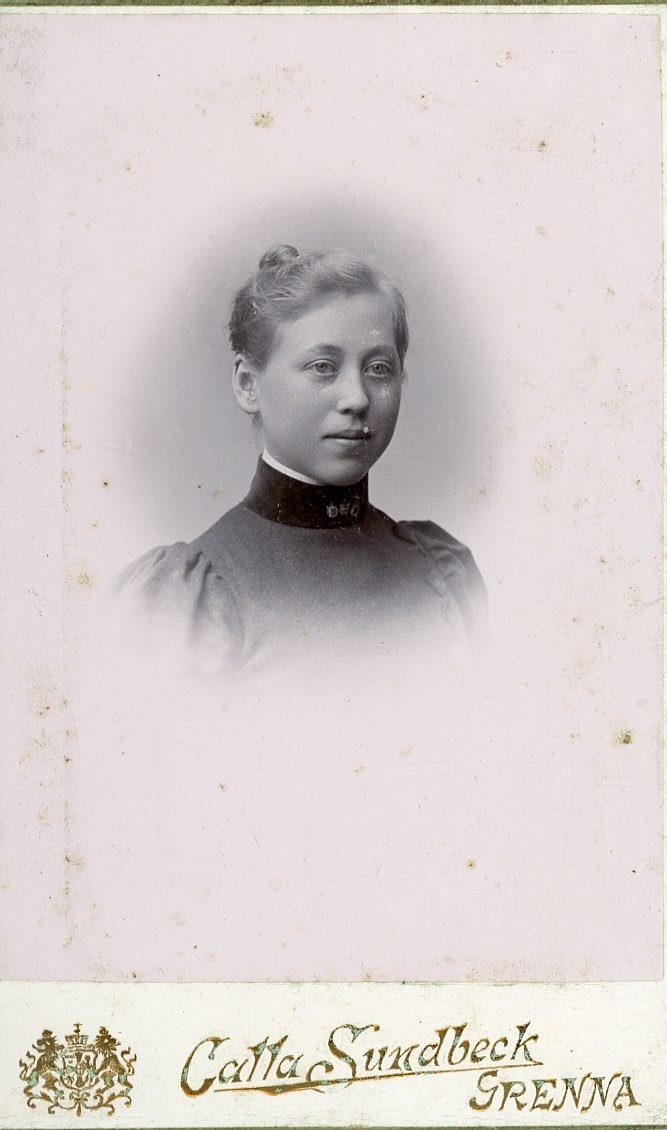 Kabinettsfotografi av en okänd ung kvinna. Håret uppsatt med en liten knut.