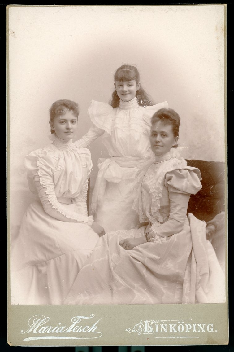 Kabinettsfotografi: tre kvinnor i olika åldrar i ljuss klänningar med krås på bröst, ärmar och puffärmar.