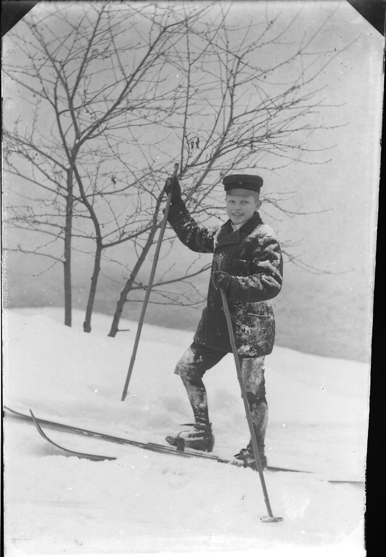 En pojke på skidor vid en husvägg. Han har lite snö på kläderna.