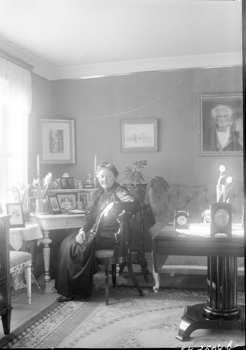 En kvinna sitter vid ett skrivbord, vänd mot fotografen. Det står i ett hörn med ett fönster till vänster.