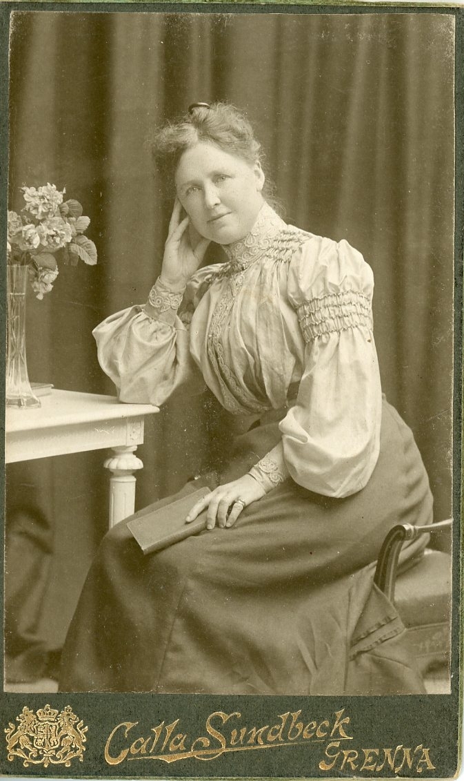 Kabinettsfotografi av en okänd kvinna som sitter vid ett bord med blommor på. Hon vilar huvudet i höger hand.
