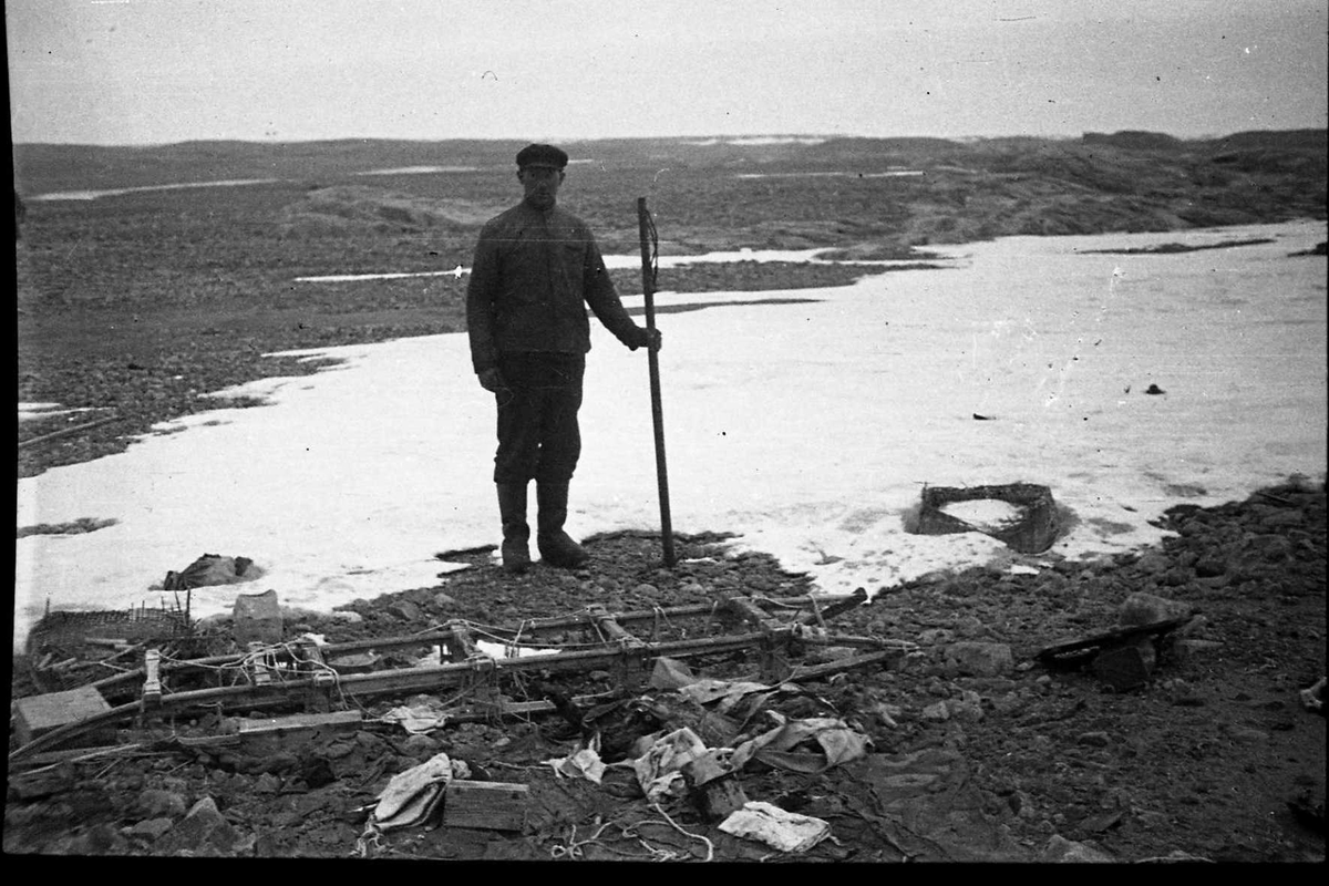 Okänd besättningsman från Isbjörn vid en av Andréexpeditions slädar på Vitön.