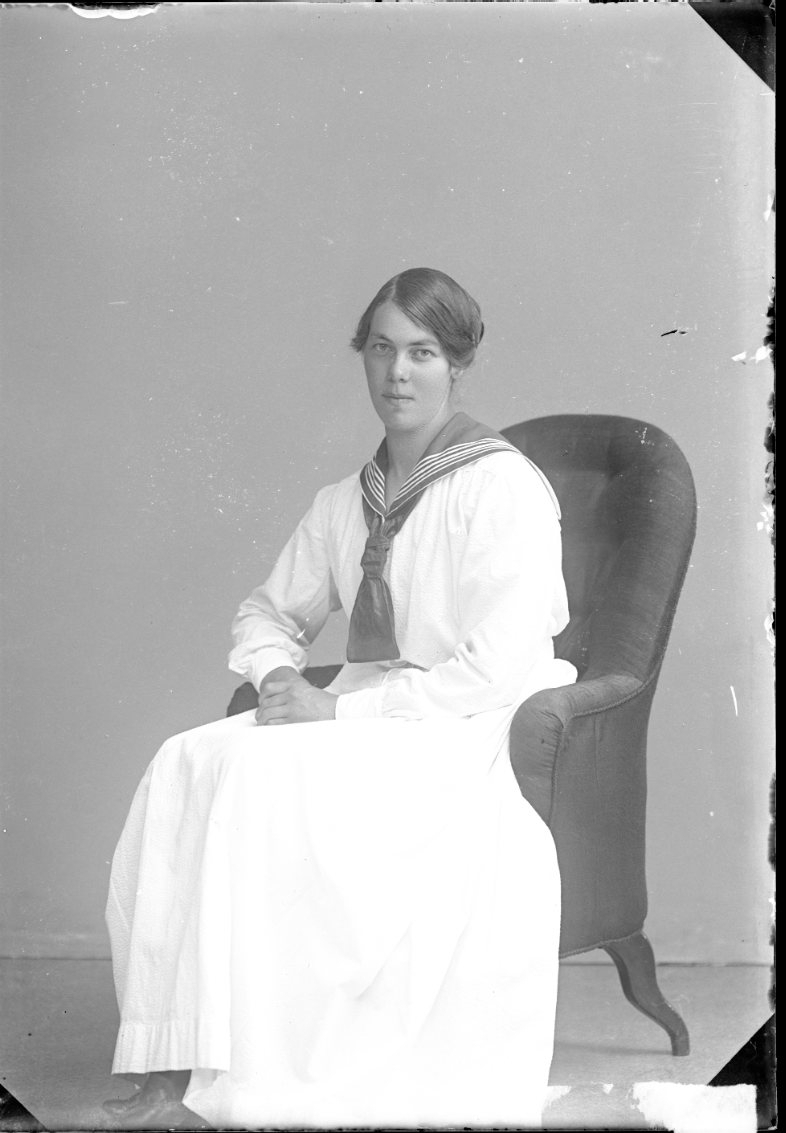 Porträtt av en ung kvinna i ljus klänning med sjömanskrage. Hon sitter i en fåtölj.