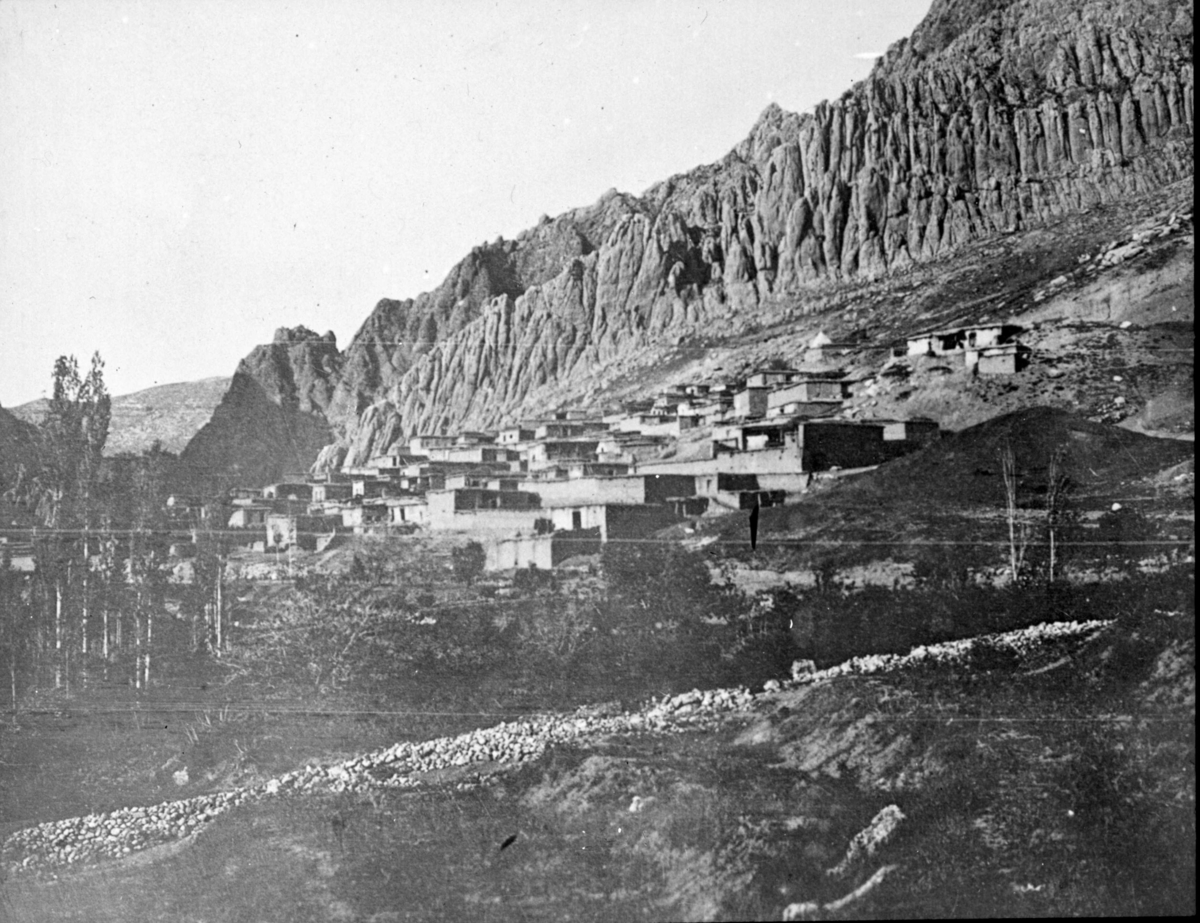 "Byn Sivend (här är också telegrafstation)". "Från Chiraz-expeditionen [Shiraz] i mars 1913" - kanske det ska vara 1912? Låg bebyggelse på slänt nedanför ett berg.