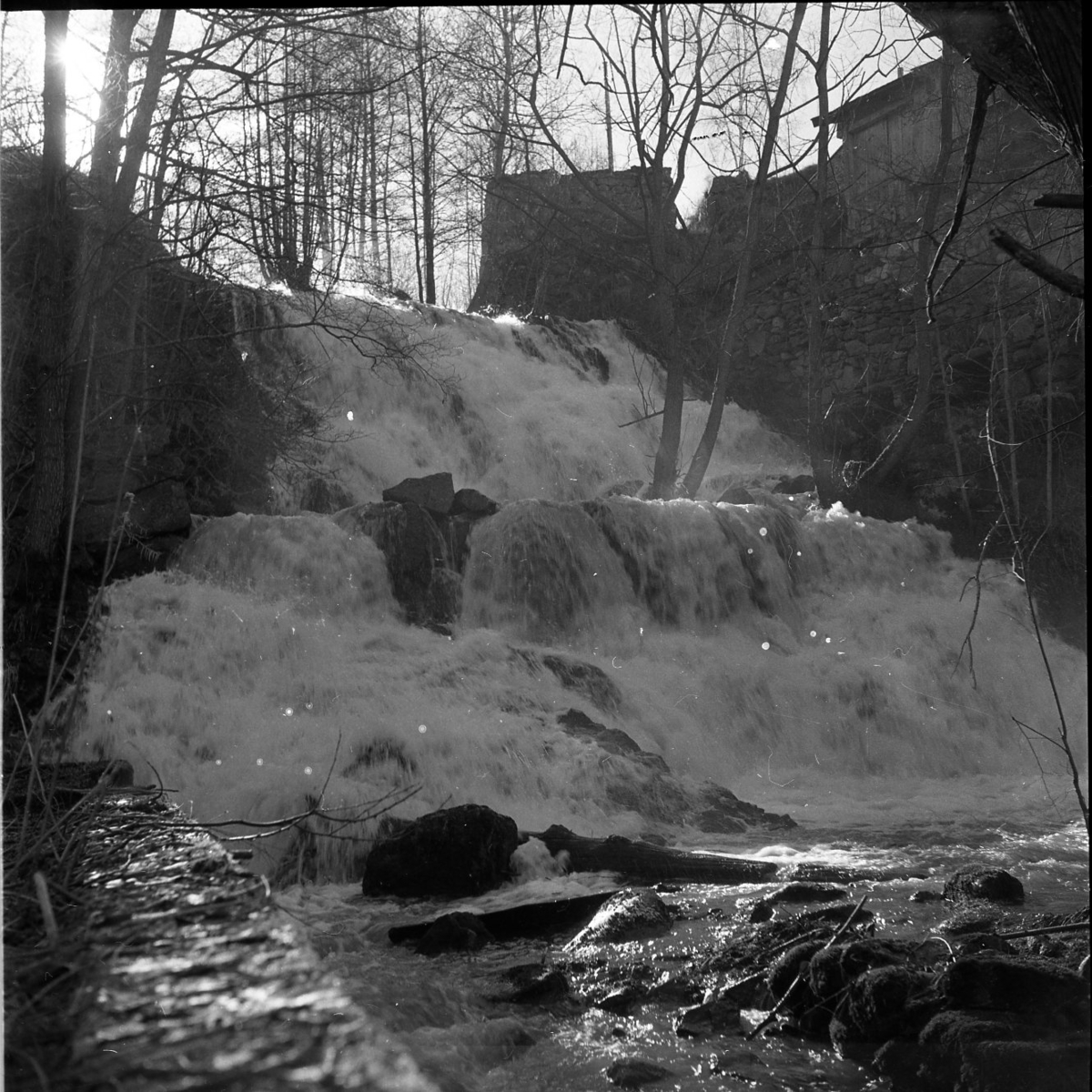 Titel: Vinterlandskap. Bilden föreställer ett vattenfall längst med Röttleån i Röttle by.