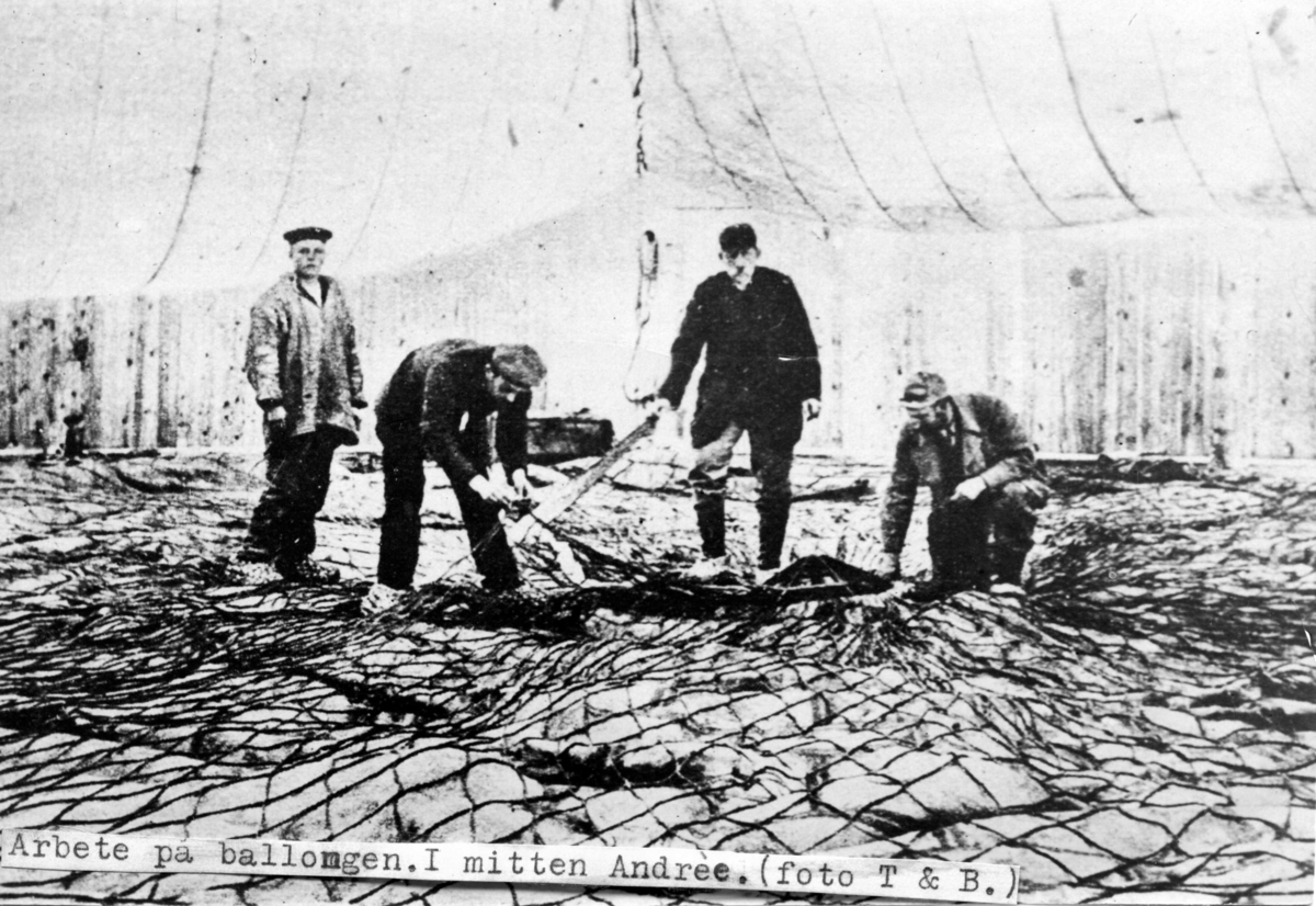 Nät läggs ut över ballongen. Alexis Machuron två fr vänster, därnäst S A Andrée och Knut Fraenkel.
