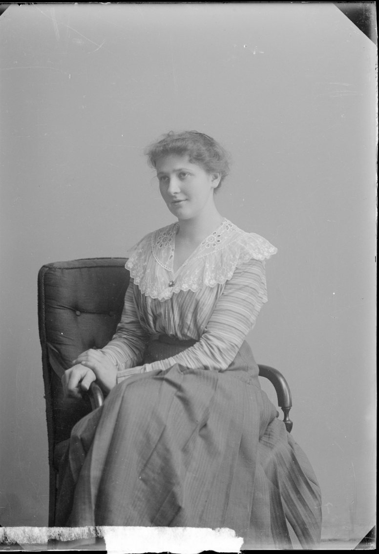 Porträtt av en ung kvinna med spetskrage som sitter i en fåtölj.