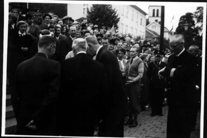 En folksamling i Braheparken i Gränna. En grupp män står på Brahegatan på väg upp i parken.