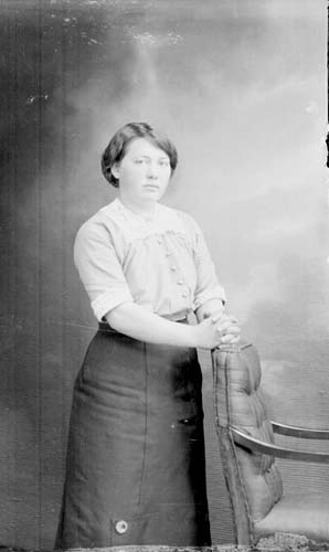 Porträtt av en ung kvinna som står med händerna på en stolsrygg.