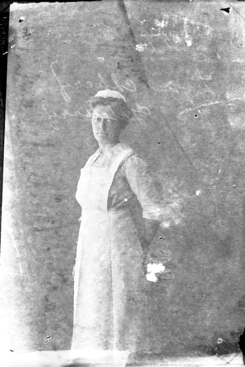 Porträtt av en kvinna med liten ljus mössa och långt förkläde, någon form av uniform?