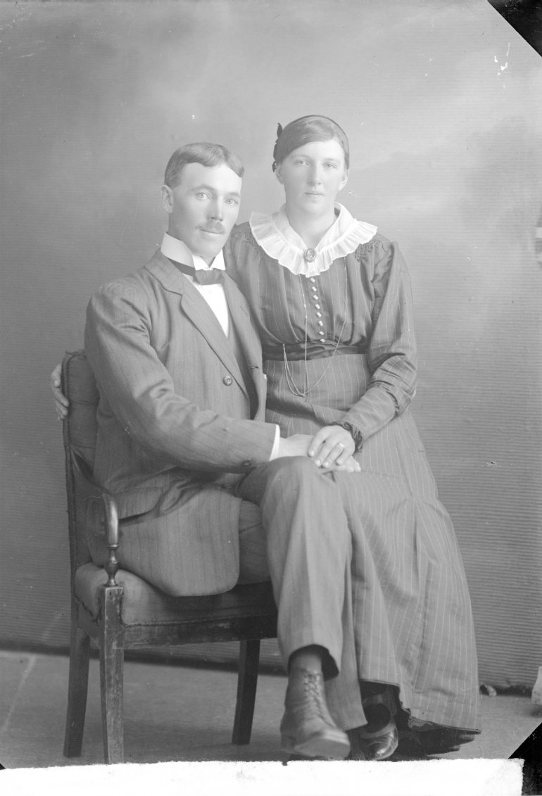 Porträtt av en ung man och kvinna som sitter i en stol intill varandra och håller varandras hand.