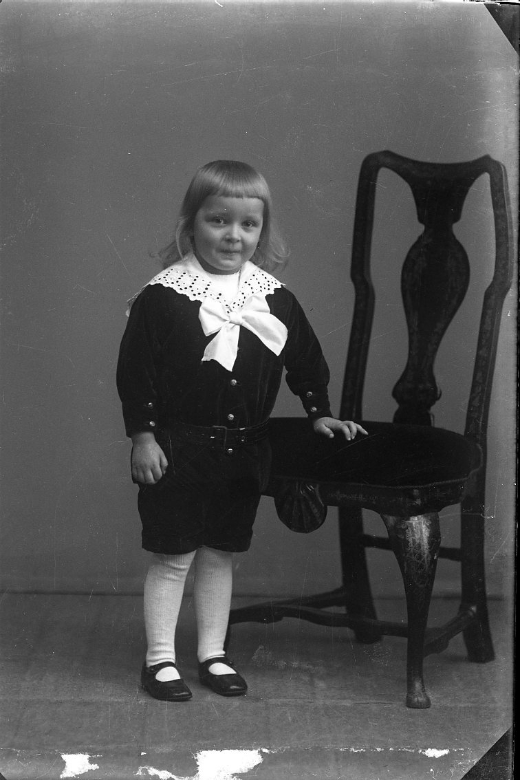 Porträtt av ett litet barn som står med vänster hand på en stol.