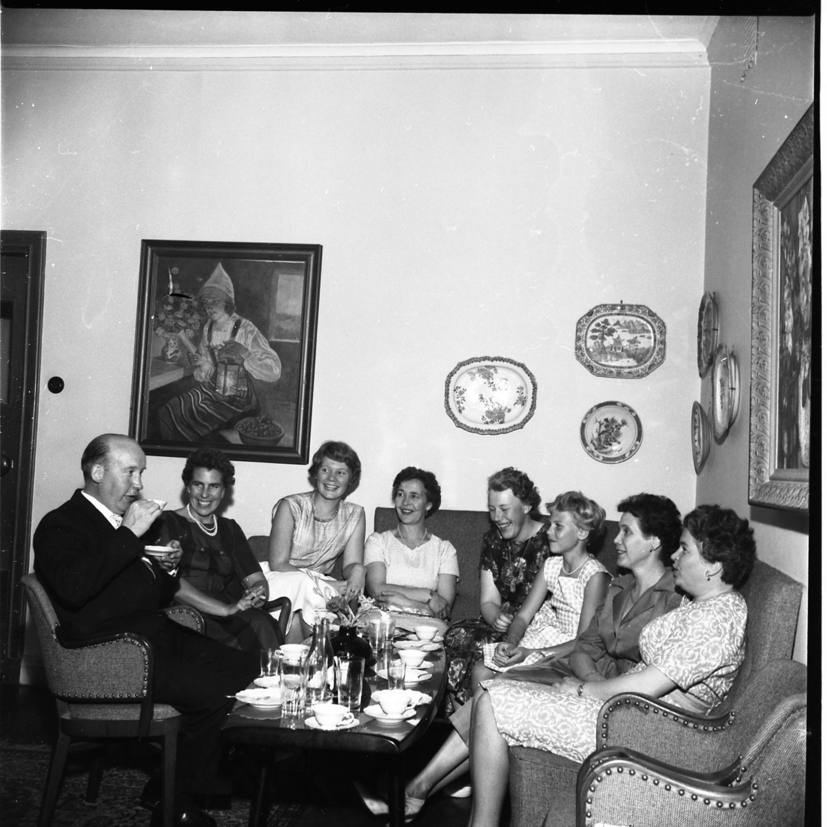 Ett sällskap bestående av en man och sju kvinnor sitter i en hörnsoffa. På bordet framför sig har de kaffekoppar. Kvinnorna tittar på mannen och skrattar som om han precis har sagt något roligt. Som två från höger sitter Birgit Heldebrandt.