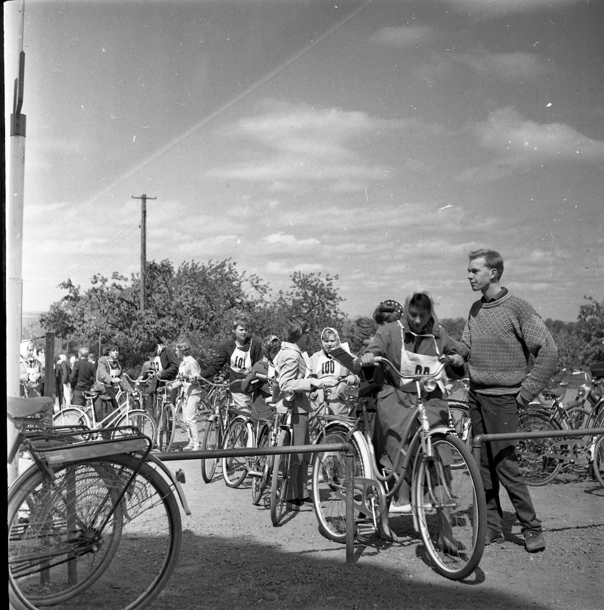 Människor står bredvid cyklar. Några bär nummer utanpå sina kläder.