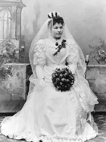 Porträtt av okänd brud med krona av grönt och en bukett blommor i knät, framför en antik fond.