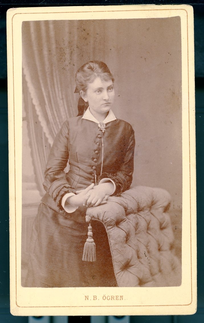 Kabinettsfotograf: Ellen Mozart, en ung kvinna som står lutad mot en fåtölj.