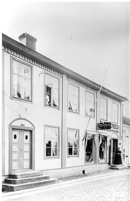 En putsad tvåvåningsbyggnad med lisener och fönsterfoder i avvikande mörkare färg. En kvinna tittar ut genom ett fönster på andra våningen. I norra entré som har dörrarna öppna står en kvinna i mörk klänning, sannolikt innehavaren av "Emma Pettersson Manufaktur & Diversehandel" - samma text är målad på väggen ovanför entrén. En plåtskylt på samma vägg säger: Emnma Pettersson Garn-Trico & Herr-ekipering"