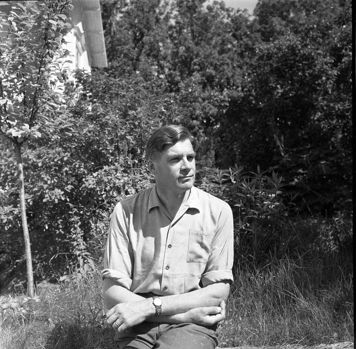 Titel: Porträtt av veterinär Bengt Lycken. Han sitter med uppkavlade ärmar på betongmur till en trädgård. Det är sommar.