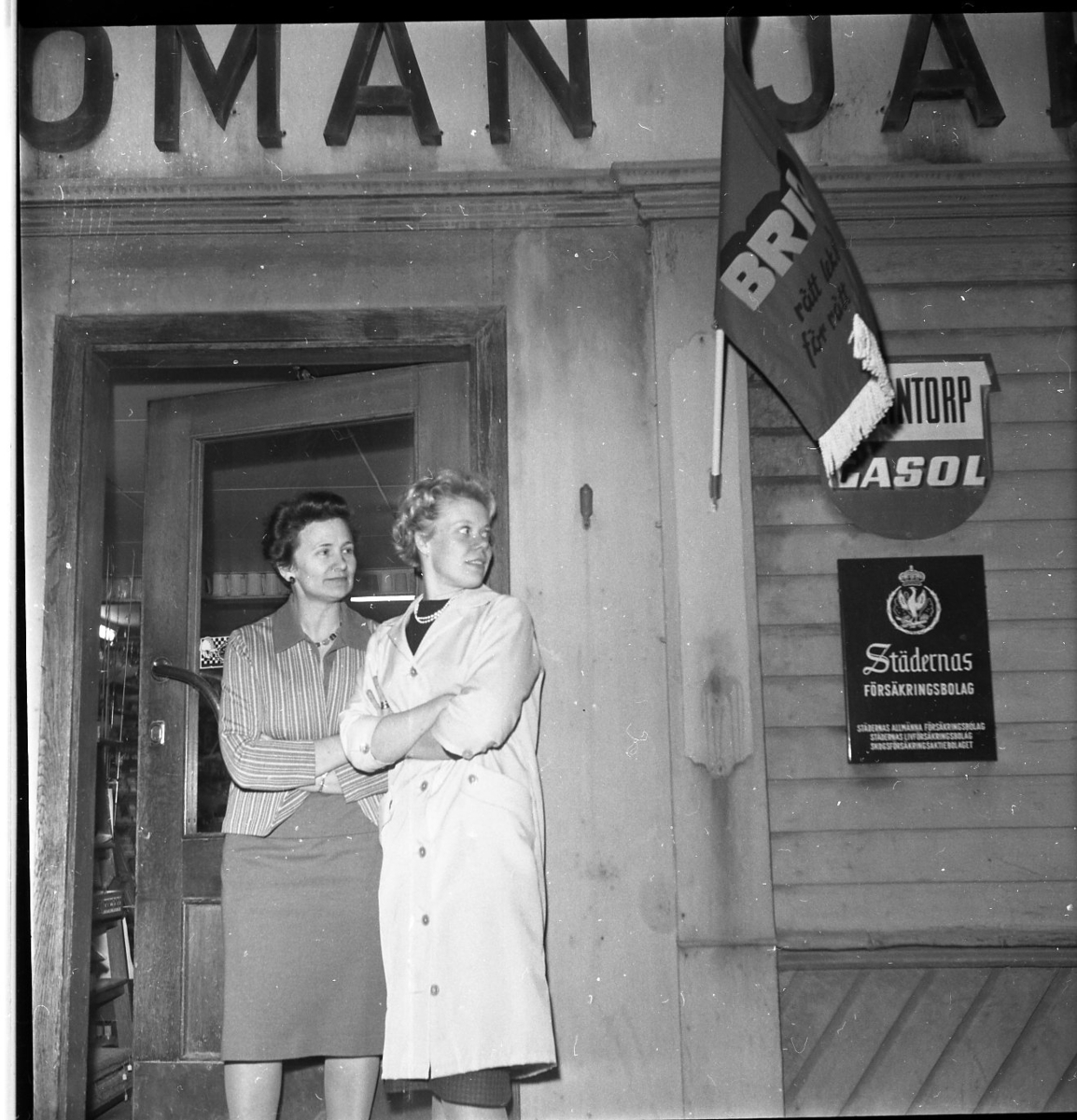 Två kvinnor står i butiksdörren till Romans Järn. Kvinnan till höger (Marianne Rundqvist) har en tunn ljus rock på sig och jobbar troligen i butiken. De tittar åt och höger och väntar sannolikt på Gränna scoutkårs lucia med följe som åker med en VW-pickup.