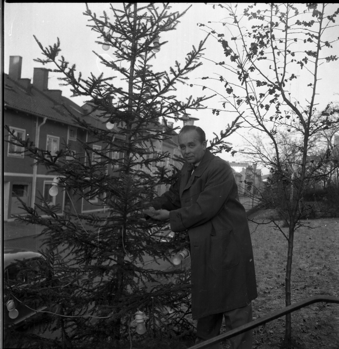 En man står och sätter upp en ljusslinga i en gran utmed Brahegatan. De är utomhus och i bakgrunden syns en husfasad. Det är eventuellt någonstans längst med Brahegatan i Gränna.