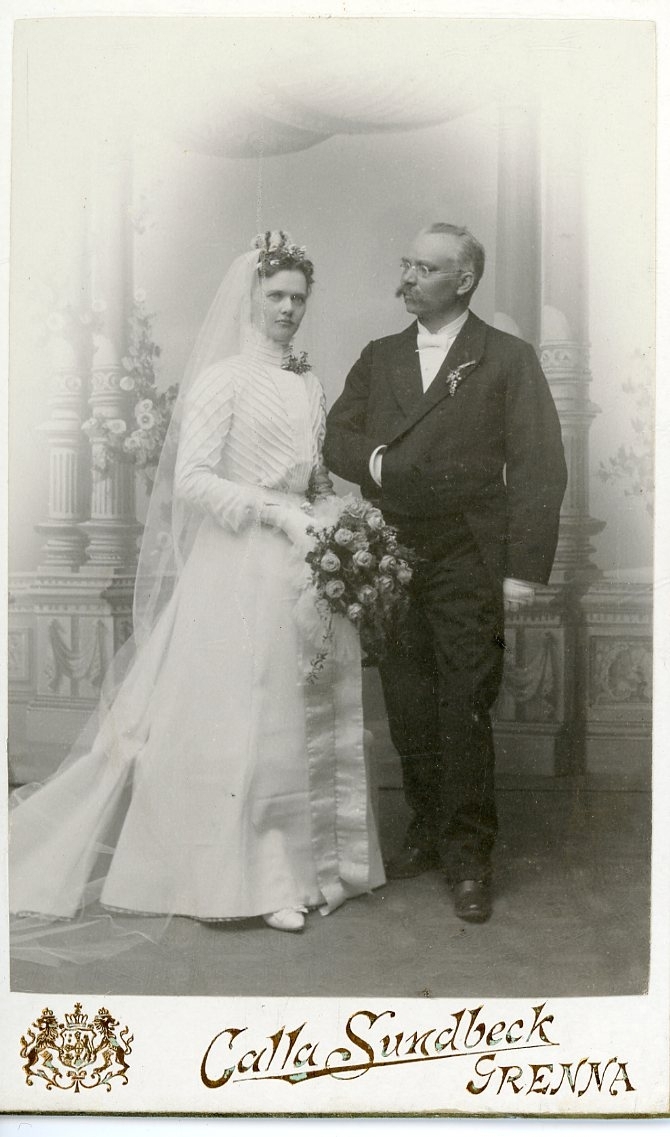 Kabinettsfotografi av ett brudpar. Kvinnan bär vit klänning.