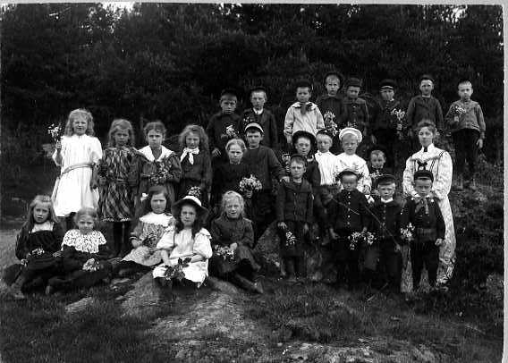 En småskoleklass från Gränna med flickor och pojkar på utflykt på Grännaberget. Barnen har blommor i händerna. Den kvinnliga läraren står till höger.