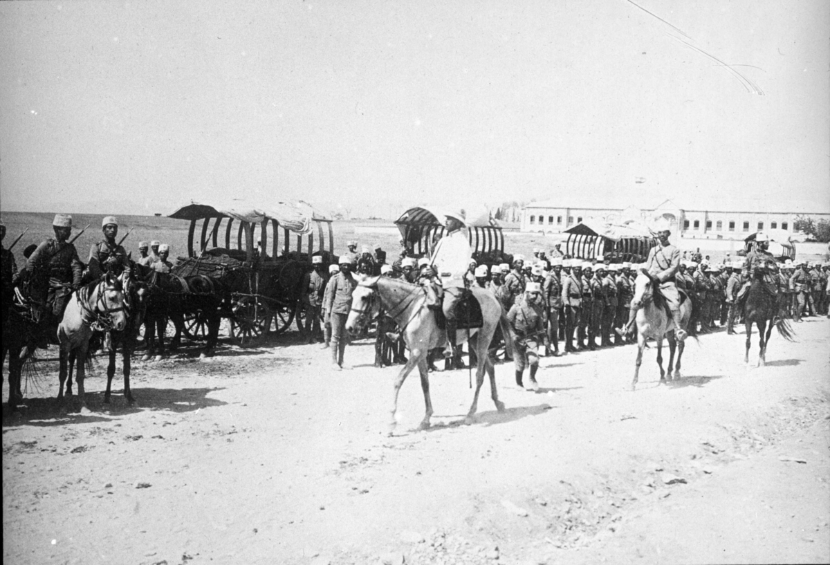 "Kärnan till 5. reg:tets (Kazvin) [Kashan] aftågar från Teheran. 1ste reg.mts kasern synes." "Från Chiraz-expeditionen [Shiraz] i mars 1913" - kanske det ska vara 1912?