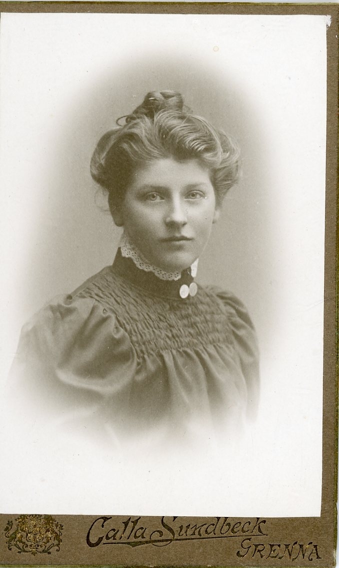 Kabinettsfotografi: bröstbild av en okänd ung kvinna med uppsatt hår i mörk klänning.