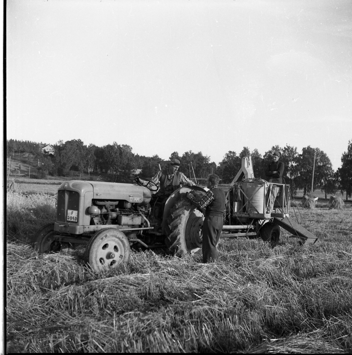 En traktor står i ett fält. Tre män står och pratar med varandra.
