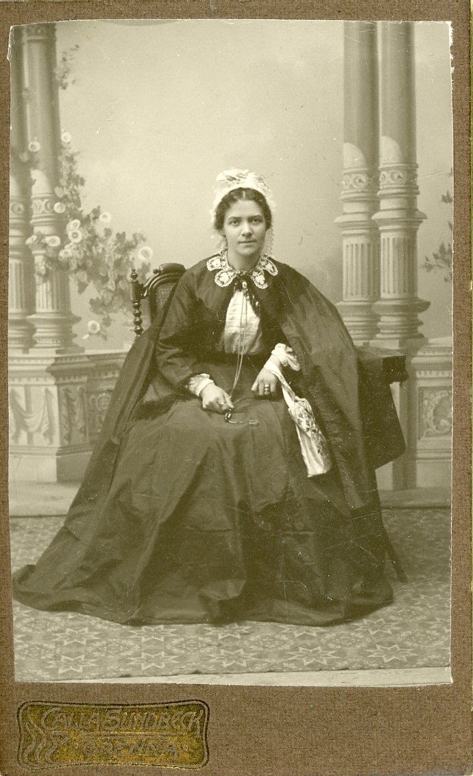 Kabinettsfotografi: en kvinna sitter i en stol.